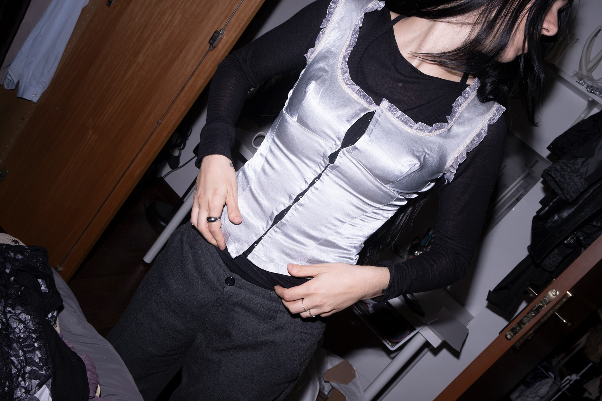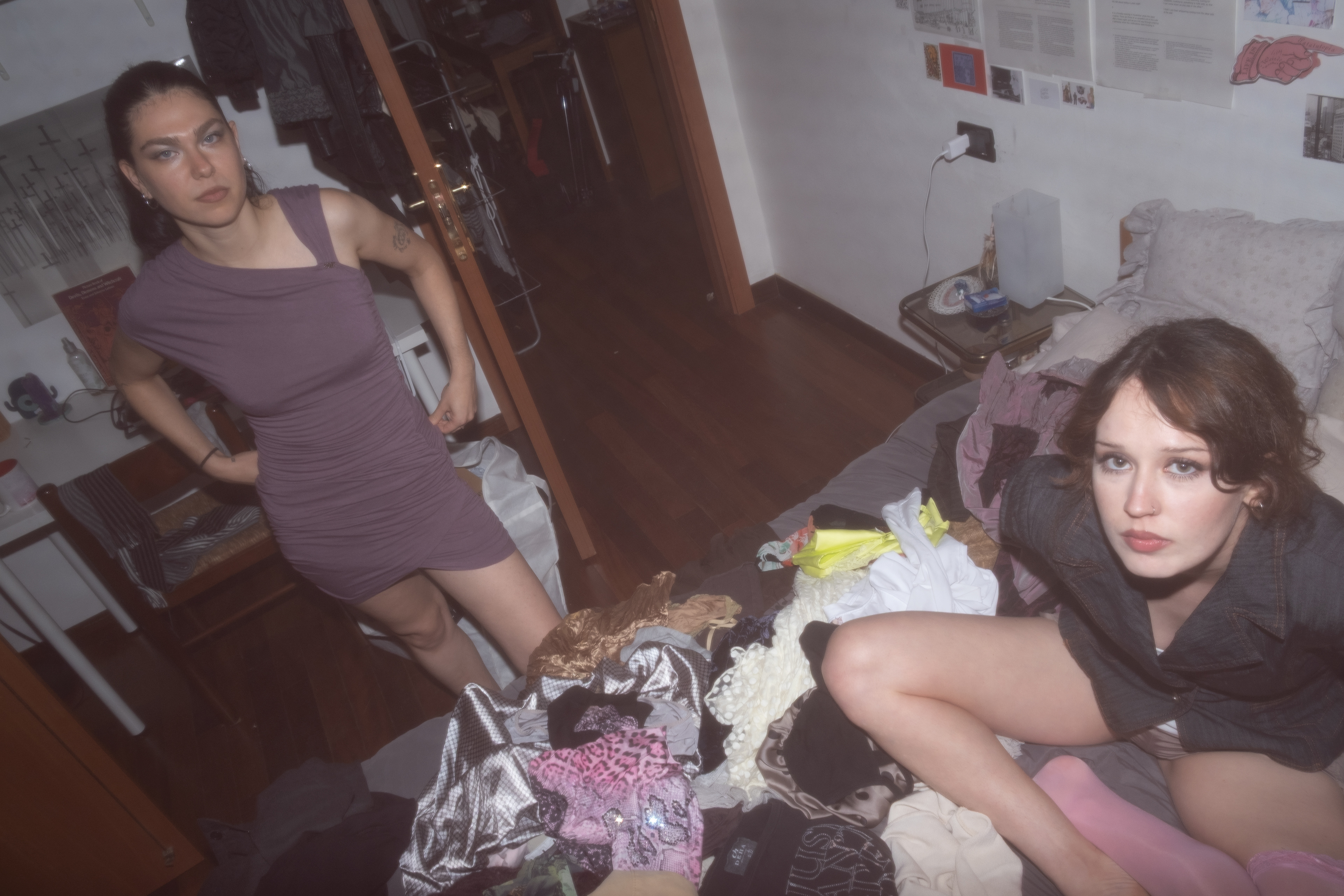 Lontano dall’essere un semplice passaggio funzionale, il tempo che precede l’uscita si dilata e si carica di significato: il corpo si trasforma attraverso tessuti, colori e gesti, costruendo un’estetica consapevole e desiderata. In questo processo, l’autorappresentazione non è mai solitaria, ma nasce dal confronto e dalla condivisione con le amiche, che diventano specchio e sostegno. La stanza si fa laboratorio, il caos creativo diventa linguaggio comune, e la preparazione si rivela come atto di immaginazione condivisa e scoperta di sé.
